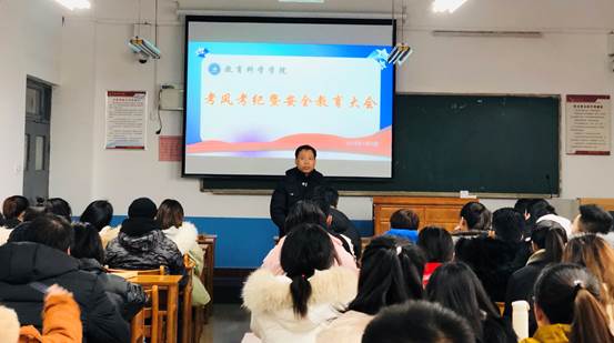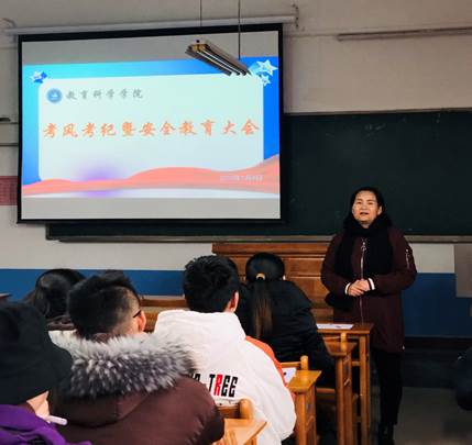 为倡导同学们“端正考风,诚信应考”,确保期末考试顺利进行,1月4日下午,9428cn太阳集团在知新楼2210教室召开了考风考纪暨安全教育大会,党总支副书记韩城忠,副院长朱芳转,辅导员张磊和全体学生干部参加了会议,本次大会由团总支书记孙宁主持。