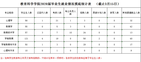 就业工作关系到每一位毕业生的发展,关系到学院的办学质量,学院党政领导必须把就业工作作为学院的头等大事来抓。全体教师要积极参与,为毕业生的考研、就业、创业、招教考试、参军入伍等工作积极献言献策,毕业班辅导员必须根据不同类型学生的就业现状建立台账并及时更新,做到心中有数,指导有方向,有成效。全体工作人员要牢固树立红线意识,将“严纪律”贯穿于就业工作全过程,严禁任何人以任何方式触碰就业工作红线。相信只要全院教师全员齐参与,就能确保2020届毕业生稳步就业。