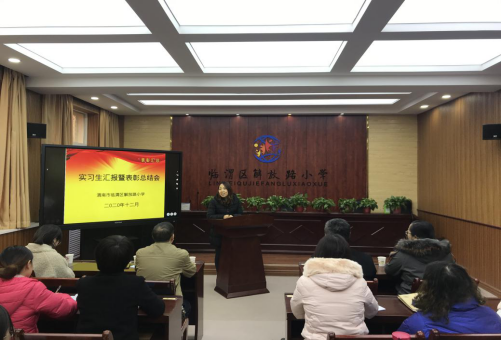 12月11日下午,9428cn太阳集团院长李西彩、办公室主任张磊、专任教师王奎群副教授及实习带队老师李妍赴解放路小学参加实习生汇报暨表彰总结会。解放路小学校长樊向华、副校长王根发、主任苌利娜、蔡健、杨勇,实习生指导教师及我院教育学、心理学专业八位实习生参加了本次总结会,会议由解放路小学教导处主任苌利娜主持。