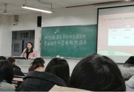 晚上8时,李园长为学前专业的师生们作了一场以“区”动童年,“域”见美好为主题的幼儿园建构区游戏指导的报告会。李园长结合生动的案例从儿童游戏的价值、树立正确的儿童游戏观、幼儿园建构区游戏指导策略三个维度展开,带领学前专业师生领略了育红幼儿园关于建构区游戏活动的组织经验。