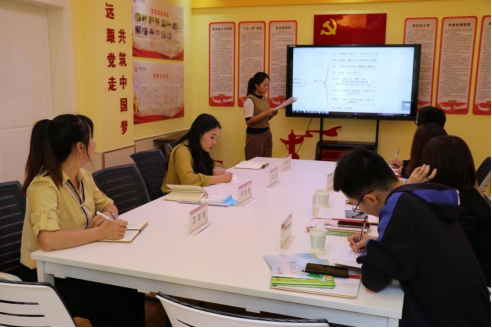 随后,团队成员与育红幼儿园教师进行了座谈和交流。安施琪老师从“理念、物质、文化”三个方面对该园“尚美”文化特色进行了详细解读。于旭艳老师从教材开发背景、教材实施、效果达成三方面系统介绍了改园特色课程《皮影演绎绘本》、《礼仪教育润童心》和《安全教育》。