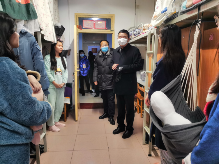 肖耀刚深入学生宿舍,首先带去学校对大家新年的祝福,肖耀刚强调,疫情防控就是命令,在全校党政的领导下,学校切实加强组织领导,汇聚强大合力,确保学生核酸检测、餐饮安全、后勤保障、校园消杀、物资供应、师生防护、学生工作、教学工作、校内管控全布局,构筑“领导小组+包联指导+专项工作组+应急专班”的校园疫情防控机制,全力保障师生身体健康和校园安全稳定,同时肖耀刚提醒大家积极、严格遵守疫情防控规定,做好自我防护。