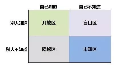 约哈里窗口理论将人的自我认知划分为开放区、盲目区、隐藏区、未知区。开放区以透明公开的窗口传递自我与他人皆知的信息,有助于保持人际关系和谐。盲目区侧重自我认识的局限性,强调他人知道而本人未知的信息。隐藏区关注仅有自我了解且不愿与他人分享的信息。未知区代表隐藏在记忆和意识深处的信息,其所包含的潜能、心理活动、成长经历会在特定的环境下激发出新的自我侧面。