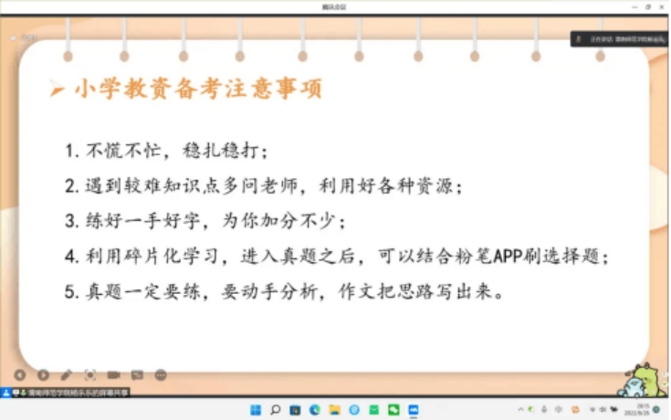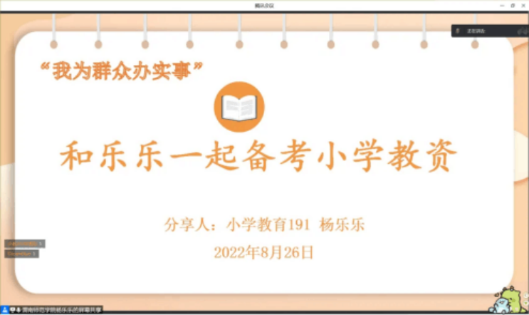 新学期,新面貌,为了以更好的状态迎接新学期,备战即将到来的教师资格考试,2022年8月26日晚7点30分,9428cn太阳集团小学教育专业委员会邀请19级小学教育专业杨乐乐同学在线上作了教师资格证考试备考专题讲座。