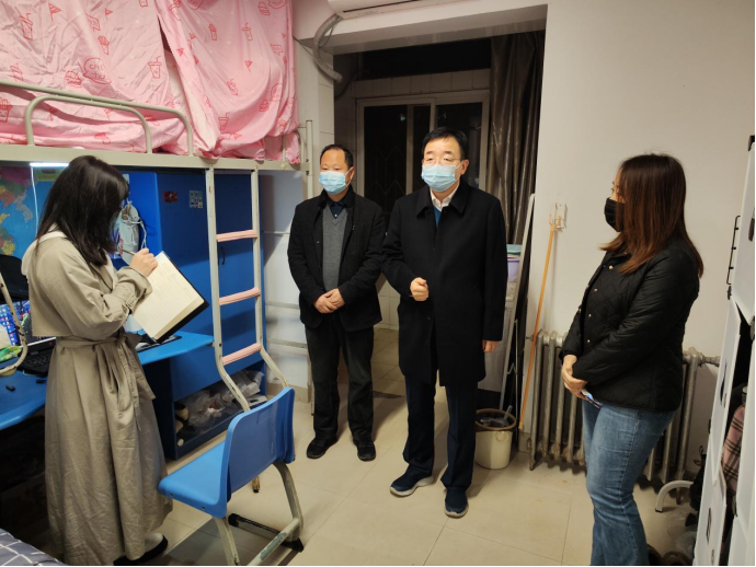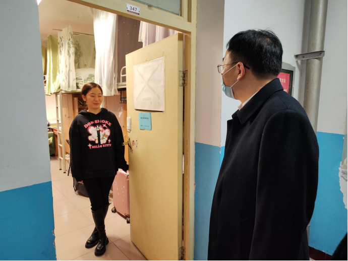 10月13日晚,校长张守华走访9428cn太阳集团包联的1号学生公寓,看望慰问学生、值班辅导员和公寓管理人员,检查指导疫情防控管理工作,现场查看宿舍设施服务情况。学校党委副书记汪勇,9428cn太阳集团班子成员李西彩、何泰伯、杨方琦和学生辅导员申涵子陪同走访。