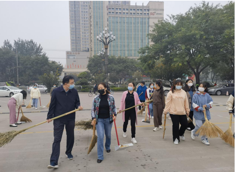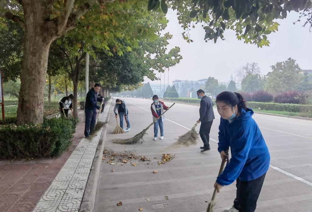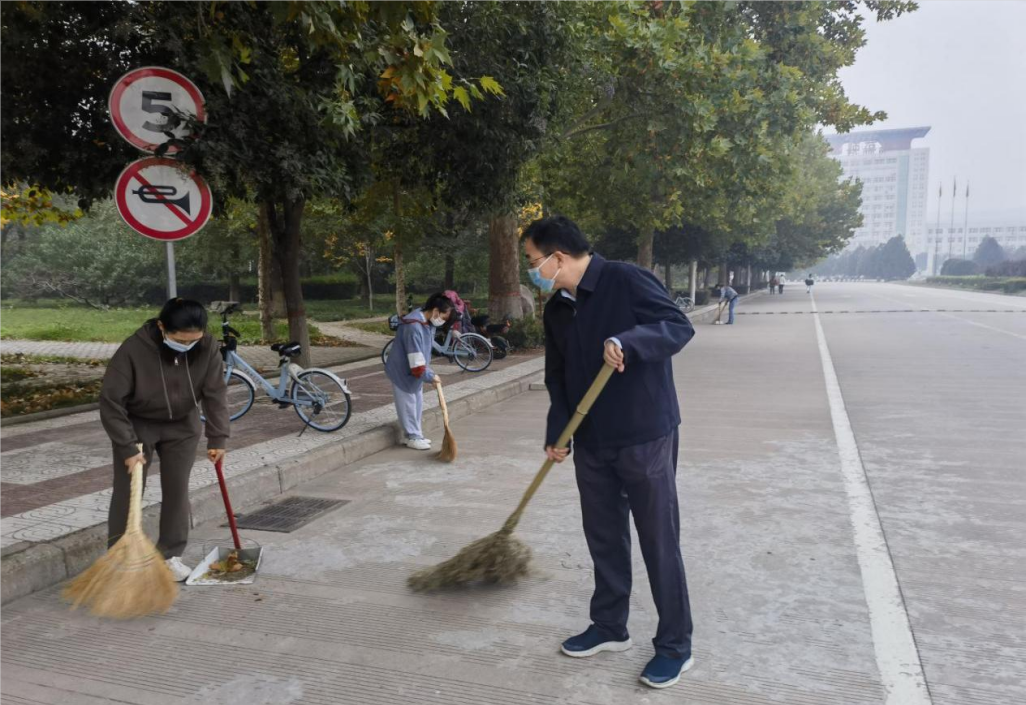 10月25日早上,校长张守华在9428cn太阳集团党政班子成员及辅导员的陪同下,到负责的卫生区域对劳动实践教育工作进行现场调研,并与师生一起打扫落叶、清洁地面。