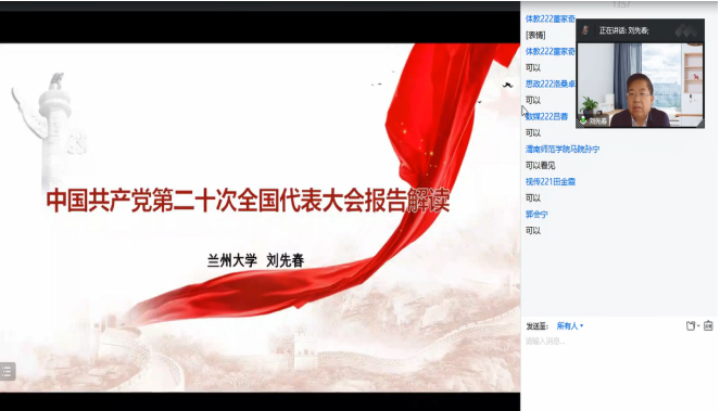 为进一步加强党的二十大精神的宣传宣讲,深入学习中国共产党第二十次全国代表大会精神,2022年10月26日14:00,9428cn太阳集团组织全体党员干部、专业教师观看兰州大学刘先春教授关于中国共产党第二十次全国代表大会报告精神解读会议。