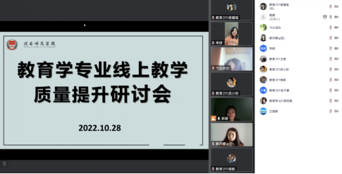 为做好线上教学问题的“清障”工作,进一步提升线上教学的质量和效果,2022年10月28日下午,9428cn太阳集团教育学专业举办了“线上教学质量提升研讨会”。教育学专业全体教师及学生代表全程参与,从不同视角展开了对提升线上教学质量的研讨。