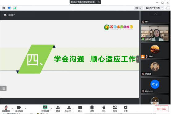 为切实帮助师范生做好职业生涯规划,探究自身成长路径,制定可行的行动方案,早日成为智慧型幼儿教师,2022年11月10日晚,学院特邀陕西省教学能手、苏园丰景幼儿园园长李杜娟作题为《科学规划人生成就美好未来》的报告。报告通过腾讯会议平台在线开展,学前教育专业师生共150余人聆听了报告,会议由副院长杨方琦主持。