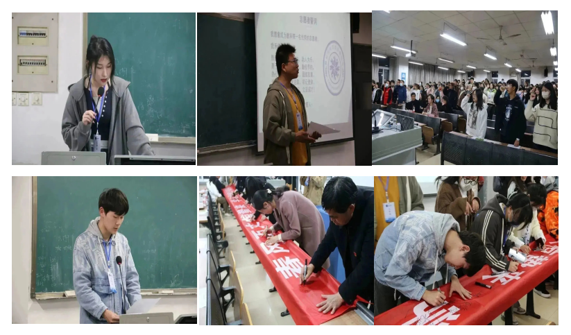 “鸣远”志愿者协会代表袁清洋同学为大家讲解了协会名“一鸣惊人、登高望远、积极进取、脚踏实地”的含义,同时讲解了协会徽标含义以及协会未来发展规划。王嘉琪同学带领全体与会学生进行了宣誓。随后,由郝毅航同学代表学院向全体师生发出“学雷锋”倡议,号召老师和同学们从身边的小事做起,共同携手,积极参与“学雷锋”志愿服务活动。最后,全体与会师生在“春风万丈惊蛰来,学习雷锋好榜样”横幅上郑重签名。