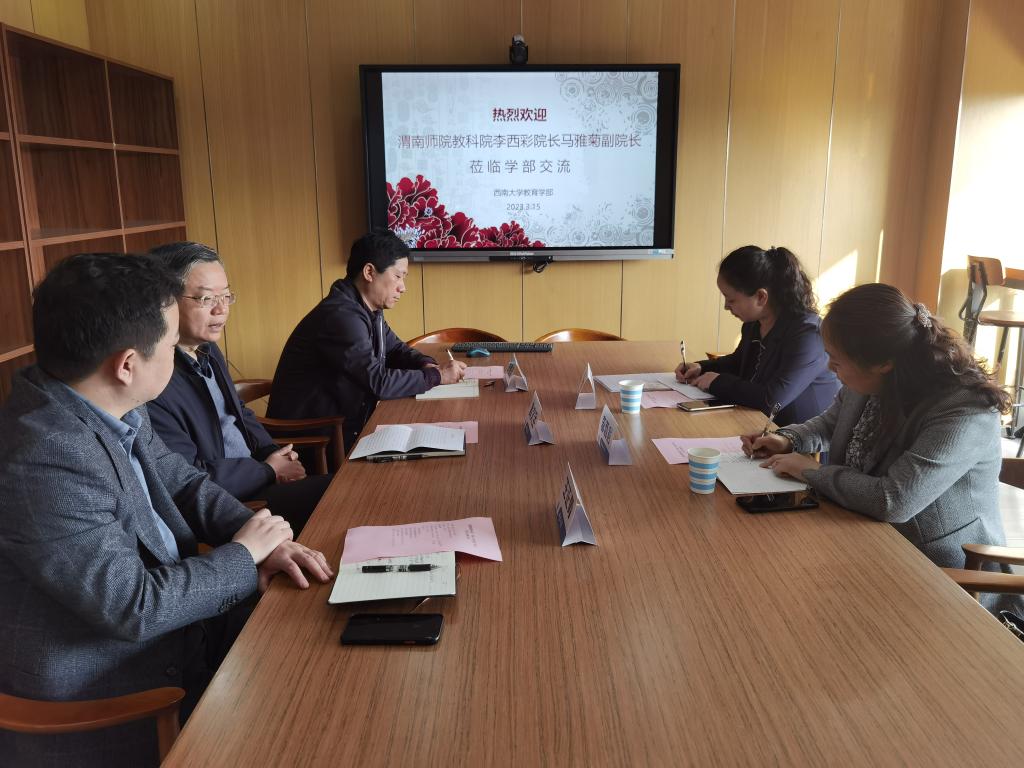 3月15日上午,9428cn太阳集团院长李西彩、副院长马雅菊赴西南大学交流学习,西南大学教育学部党委书记周文全、副部长王正青、西南大学一流学科建设办公室主任张家军参与交流,交流会由西南大学教育学部副部长王正青主持。