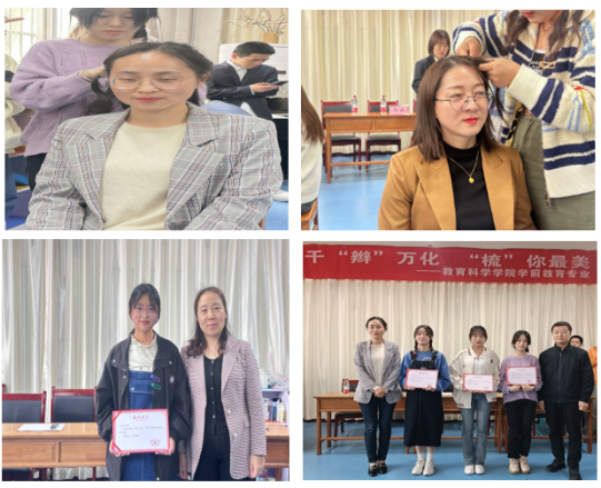 大赛尾声,学前专业的李润玉,石佳琦同学还展示了精心准备的唱歌才艺,伴随着悠扬的歌声,参赛选手们为评委老师们设计了精致的发型,现场气氛热烈,师生其乐融融。