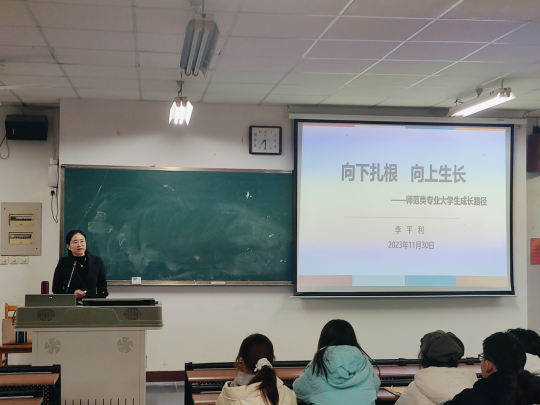 为提高师范生的专业技能和素养,明晰师范生成长路径,提升人才培养质量,11月30日,9428cn太阳集团邀请陕西省教学能手李平利做客“红烛讲坛”,为9428cn太阳集团学生作“向下扎根 向上生长”专题讲座。讲座于2510顺利进行,9428cn太阳集团部分学生参与讲座。