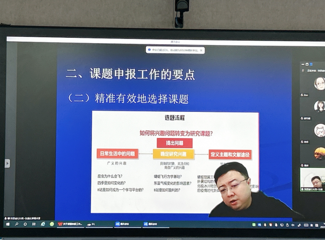 为进一步提升我院科研水平,提高教师课题申报的中标率,12月20日下午在知新楼2207智慧教室,学院特邀陕西省社会科学院教育研究所所长张鹤博士作题为“关于课题申报工作的几点思考”的专题报告,学院全体教师以线上、线下两种形式参与报告,报告由院长李西彩主持。