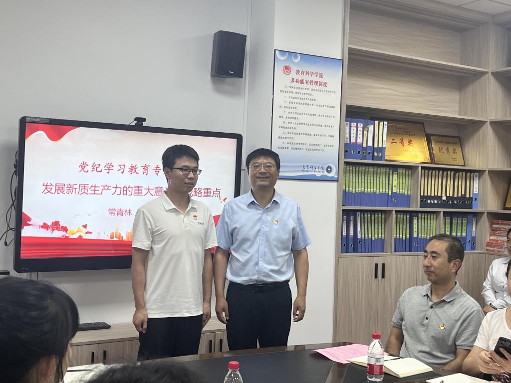 入党宣誓仪式后,副校长常青林为与会党员作了题为《发展新质生产力的重大意义与战略重点》的主题报告。常校长从“新质生产力的基本内涵与主要特征、加快发展新质生产力的重大意义、加快发展新质生产力的战略重点以及加快发展新质生产力的渭师担当”四个方面深入浅出地阐述了发展新质生产力的重要性及必要性。他强调,要深入实施创新驱动发展战略,充分发挥教育、科技、人才“三位一体”的战略支点作用,建立高质量教育体系,推进产学研深度融合,不仅给出了渭师答案,更体现了渭师担当,引发广大师生的强烈共鸣和深入思考,对进一步建设社会主义现代化强国,实现中华民族伟大复兴具有重要意义!