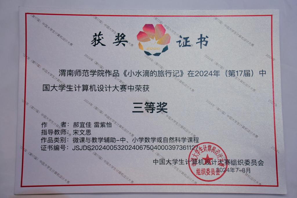 其中,我院宋文思教师指导,郝宜佳、雷紫怡同学创作的微课作品《小水滴的旅行记》在此次比赛中荣获三等奖。该作品经过现场答辩,凭借其精心的教学设计、精美的画面呈现以及高效的信息传达,充分展现了现代化手段与教学内容的深度融合,不仅展现了学生的技术实力,也体现了他们对教学理念的深刻理解和创新能力,获得了大赛评委们的一致好评。
