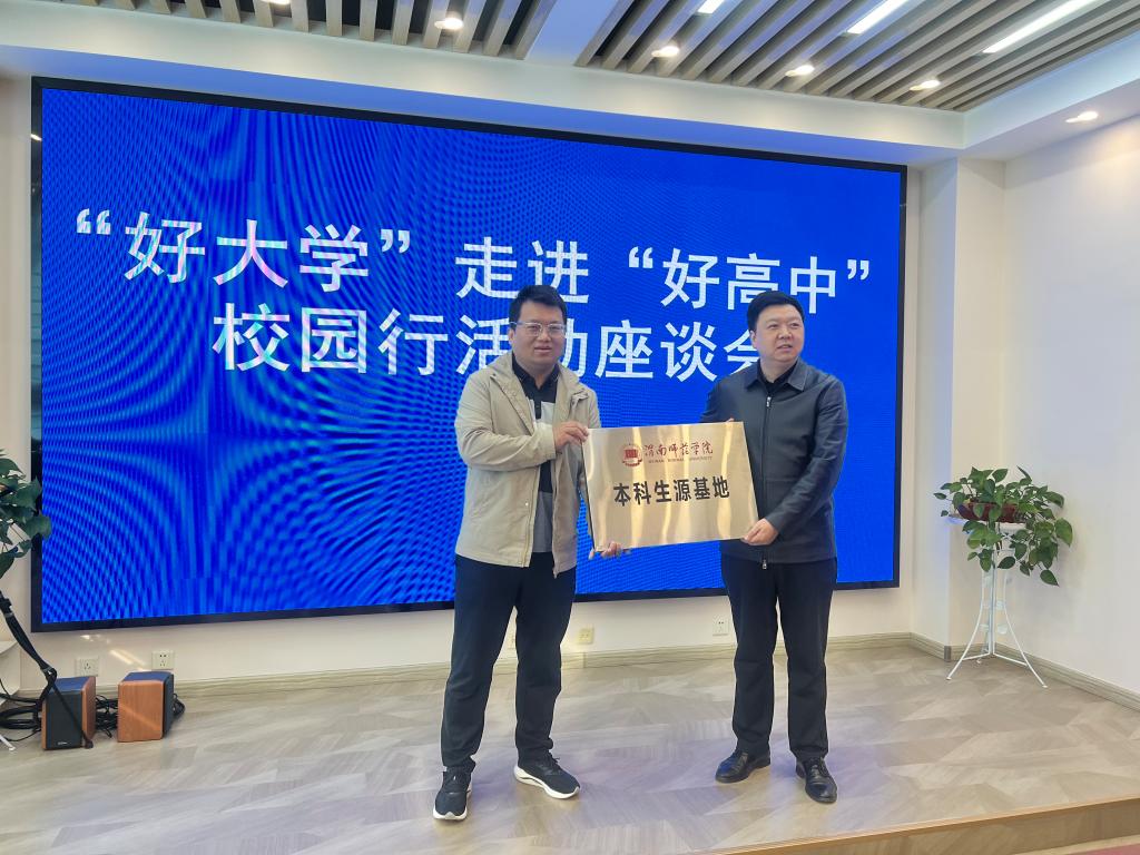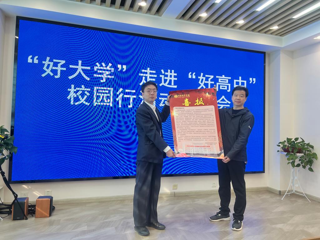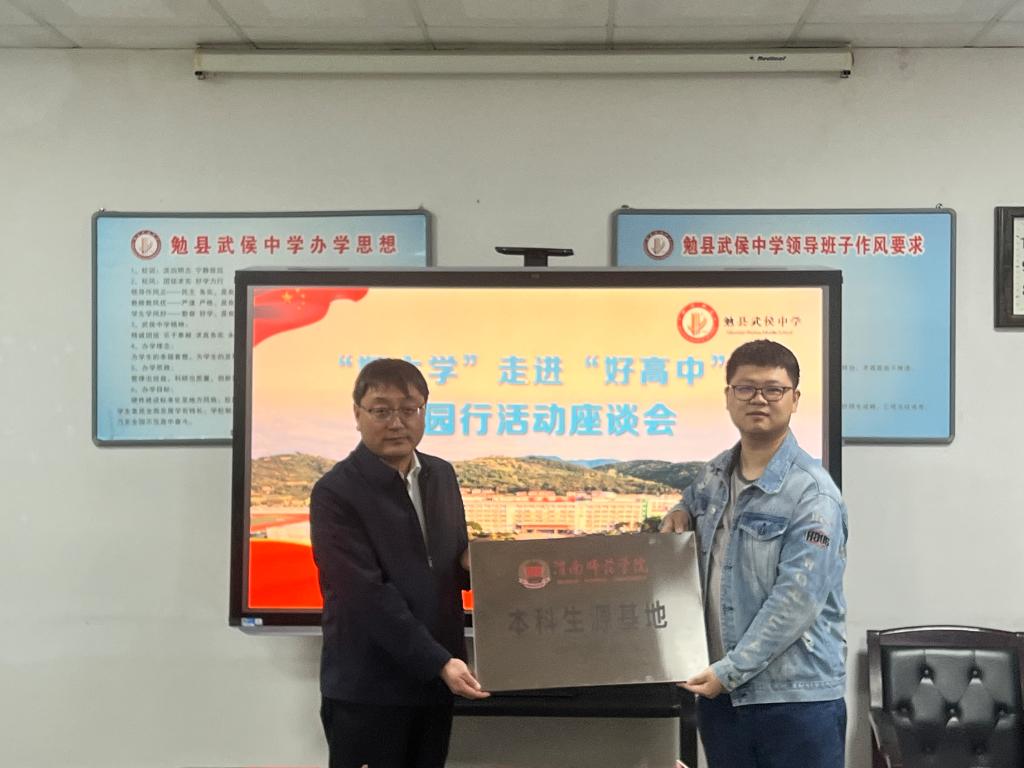 在勉县武侯中学,祝君年校长代表学校对各高校的到来表示热烈欢迎,并介绍了学校的办学理念、发展历史、教学质量及办学成果等情况。随后,太阳集团向武侯中学授优质生源基地牌并赠送录取喜报,并做了现场招生宣传。