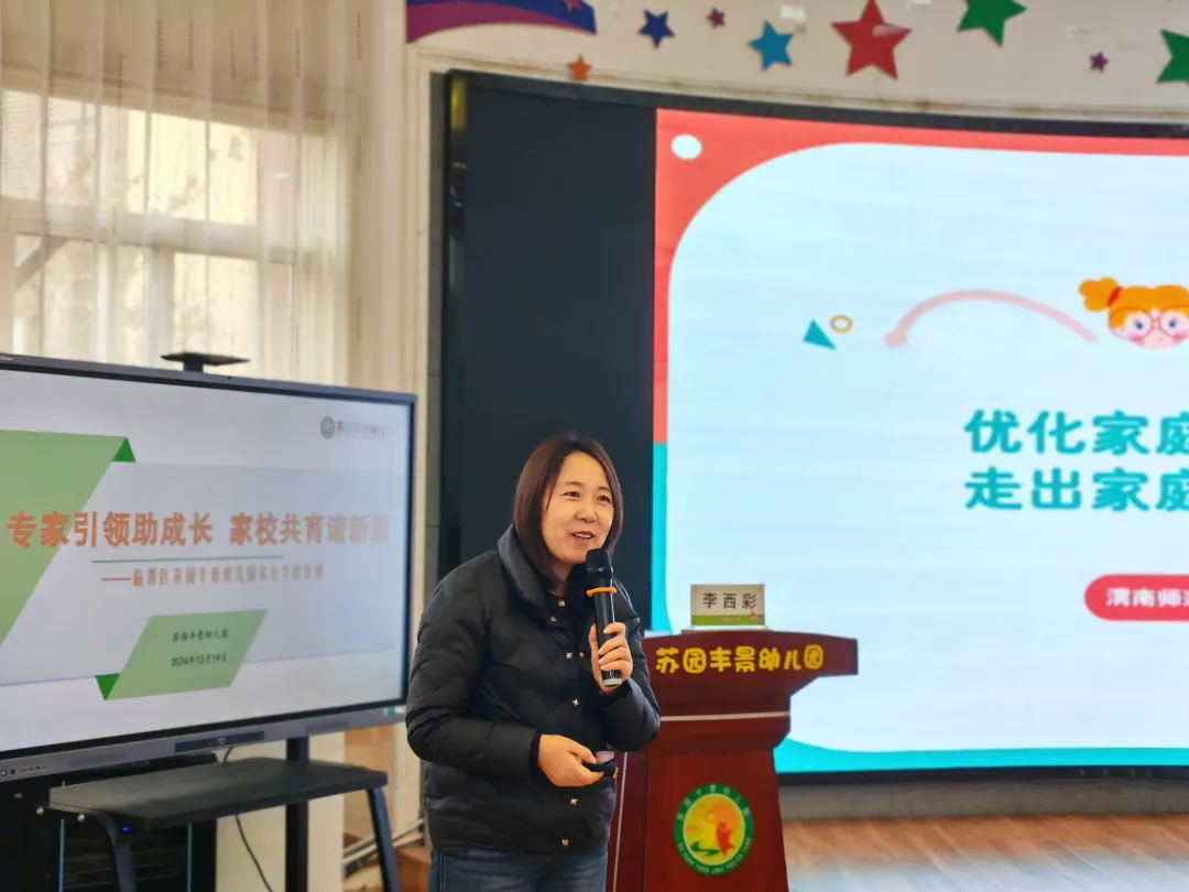 12月19日,我院院长李西彩教授赴渭南苏园丰景幼儿园为60多位家长开展了《优化家庭教育模式 走出家庭教育误区》专题讲座,李西彩以问题导入、引导家长明晰家庭教育对幼儿良好生活习惯、个性品质、社会适应能力的形成和发展至关重要。交流对话环节,李院长和家长们就孩子在园表现,日常行为以及家庭教育中遇到的困惑等问题进行了深入的探析。此次活动不仅使家长认识到家庭教育的重要性,也进一步促进了家园合作。