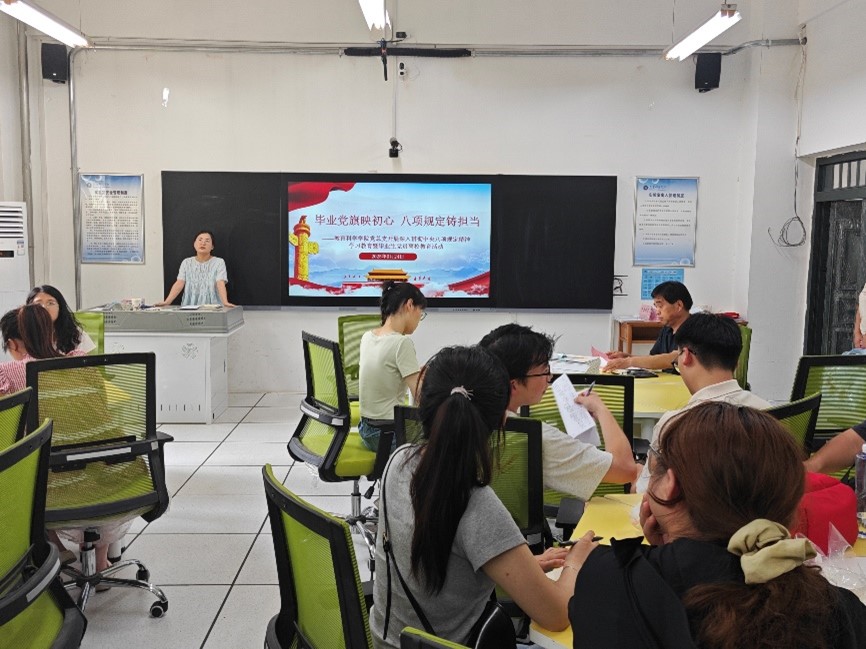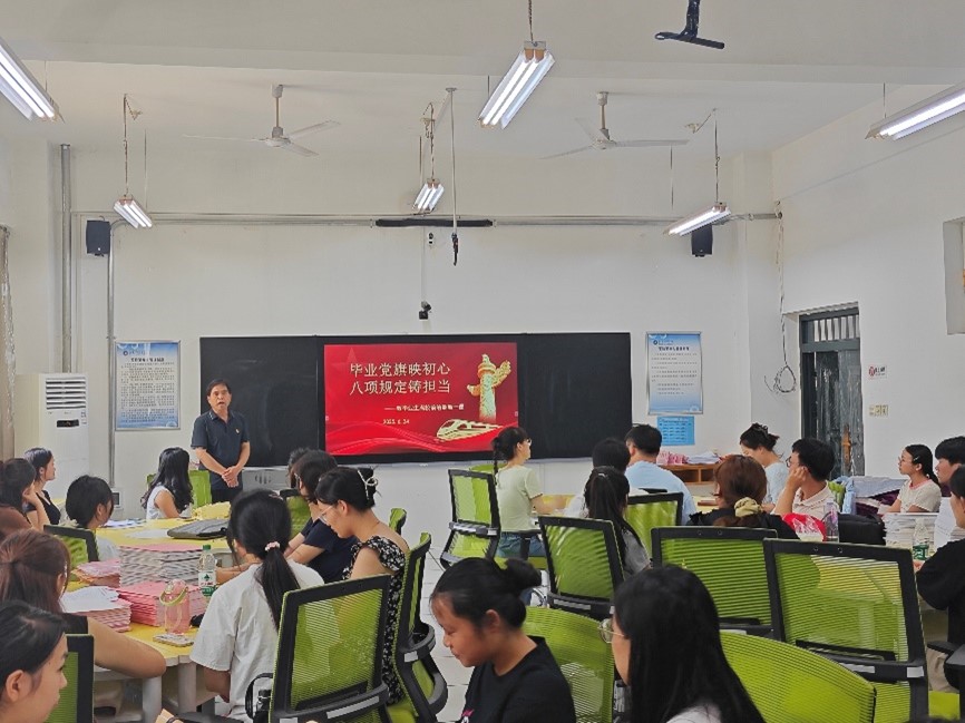 6月24日下午,9428cn太阳集团在2110教室举办以“毕业党旗映初心 八项规定铸担当”为主题的2025届毕业生党员离校教育活动,通过“专题党课+经验分享+重温誓词”的形式,为即将踏上新征程的毕业生党员上好“最后一堂党课”。学院党总支书记李武军、第二党支部组织委员李旭君及全体毕业生党员参加活动。本次离校教育主题活动由党务秘书崔娟主持。
