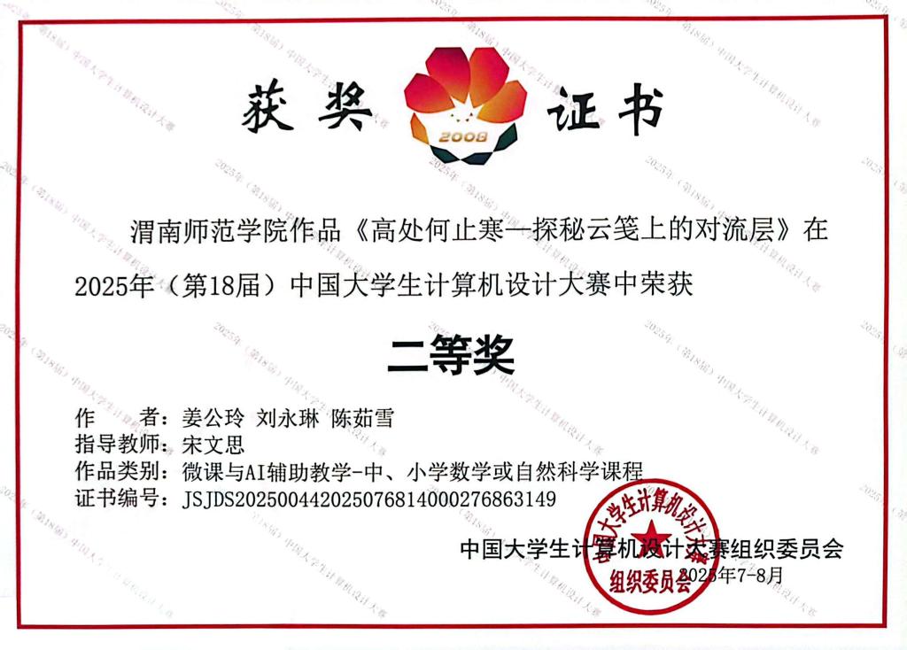 其中,由我院宋文思老师指导,姜公玲、刘永琳与陈茹雪同学共同设计的微课作品《高处何止寒—探秘云笺上的对流层》在本届大赛中荣获二等奖殊荣。该作品凭借出色的教学设计,以三大核心亮点征服评委:一是创新性的“诗境科学”课程架构,将苏轼诗词与大气科学深度融合;二是层层递进的问题链设计,实现从科学认知到环保责任的无缝衔接;三是生动直观的实验可视化呈现,通过空气对流模拟实操环节让抽象原理具象化。作品充分展现了AI技术与学科教学的前沿融合,彰显了其将传统文化与现代教育理念有机结合的创新能力,赢得评审专家的一致赞誉。