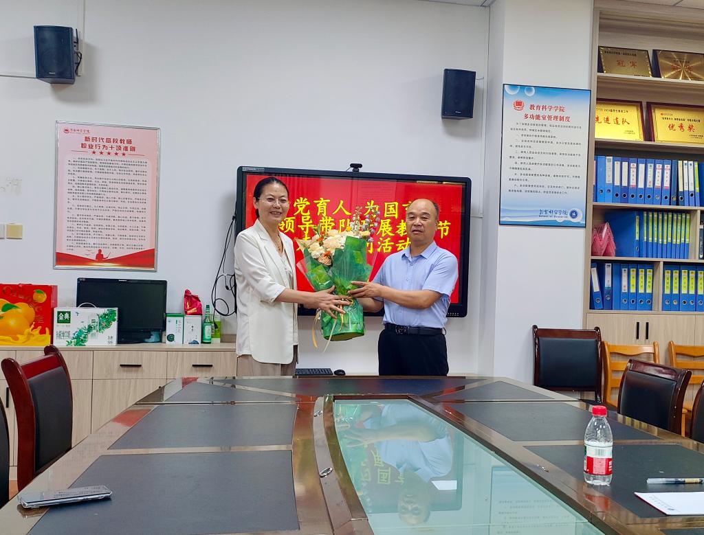 座谈中,卢爱刚与严苏凤教授亲切交谈,详细询问其在课程建设、教学改革、科研项目推进等方面的进展,关切了解她的日常工作节奏与生活保障情况。他高度肯定严苏凤教授长期以来在教育教学领域的深耕付出——无论是创新教学方法、培育优质课程,还是牵头学科建设、推动学术成果转化,亦或是发挥专业优势服务地方教育发展,均为学校人才培养质量提升和学科影响力增强作出了突出贡献。期间,卢爱刚代表学校为严苏凤教授送上节日鲜花,既感谢她多年来对学校发展的无私奉献,也向始终坚守教学科研一线的全体教职工传递学校党委的关怀与敬意。
