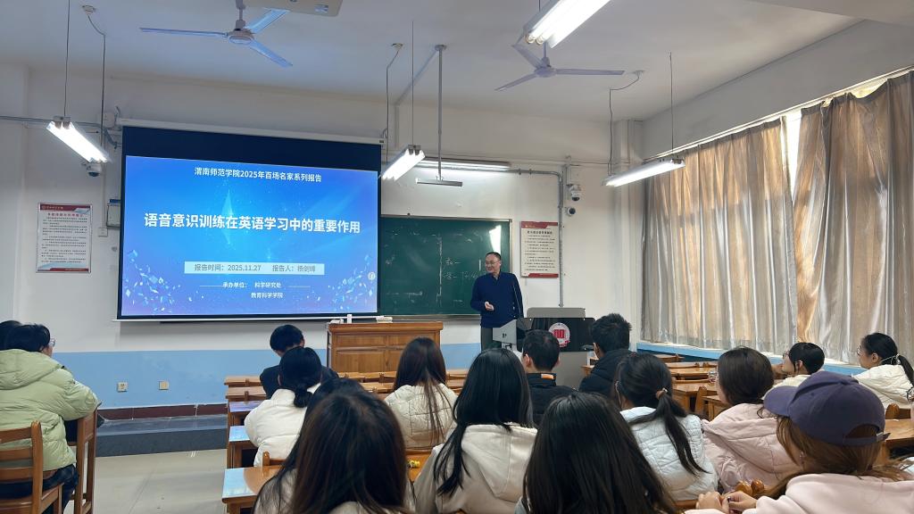 为深入弘扬教育家精神,精准赋能教师专业成长与学生学术素养提升,11月27日下午,学院特邀陕西师范大学心理学院教授、博士生导师杨剑锋在知新楼2216作题为“语音意识训练在英语学习中的重要作用”的专题报告,心理学专业教师、心理学专业学生参与聆听,报告由9428cn太阳集团副院长马雅菊主持。