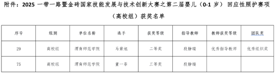 大赛紧密围绕0-1岁婴儿的身心发展特点,全面考察选手在日常照护、观察评估、发展支持及情感回应等方面的专业知识、实操技能与人文关怀能力。经过理论机考与实操环节的激烈角逐,我院选派的马紫旭、董一菲同学凭借扎实的专业基础和稳定的现场发挥,分别荣获大赛二等奖、三等奖,充分体现了他们在婴幼儿照护领域的专业积累与实践能力。