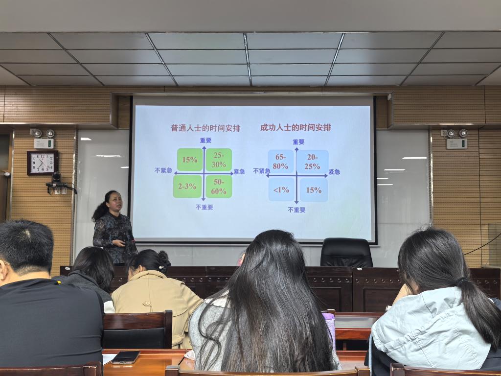 在随后的讲座中,马雅菊围绕“压力的认知”与“压力的管理”两大核心板块展开系统讲解。在压力认知部分,她详细阐释了压力的科学含义,深入分析了压力产生的关键要素,梳理了压力从萌芽到显现的完整过程,并进行了压力的测评帮助教师精准识别自身压力状态。在压力管理部分,她从管理原因、管理评估、管理反应三个维度构建了完整的压力管理体系:明确指出压力管理的核心目标是减少压力本身及压力带来的不良影响,强调科学评估是制定有效管理方案的前提,同时分享了一系列实用的压力应对技巧。