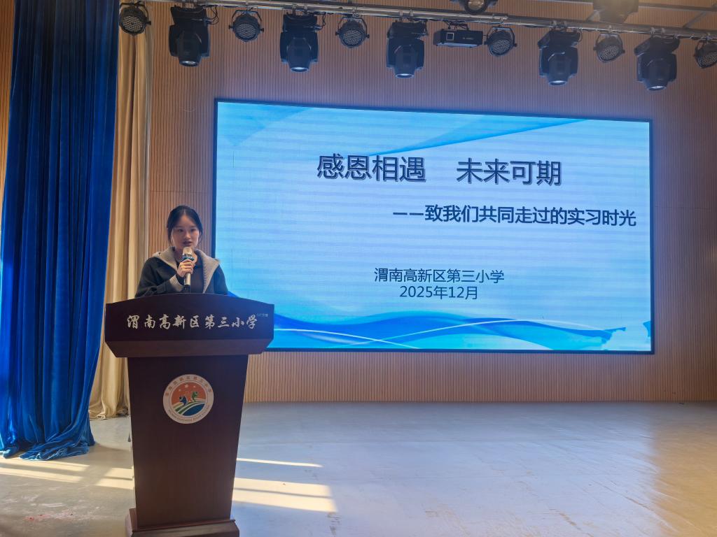 活动在温馨的氛围中拉开序幕。实习生代表焦雪晴、程媚依次上台发言,深情分享了她们在高新三小这片教育沃土上的所见、所学、所感。字里行间充满了对太阳集团培养的感谢,对高新三小提供宝贵实践平台的感激,以及对指导教师们深深敬意。她们由衷表达了对三小师生的真挚祝福,以及对母校和实习学校未来发展的美好祝愿。其真挚的情感与显著的成长,赢得了在场师生的阵阵掌声。