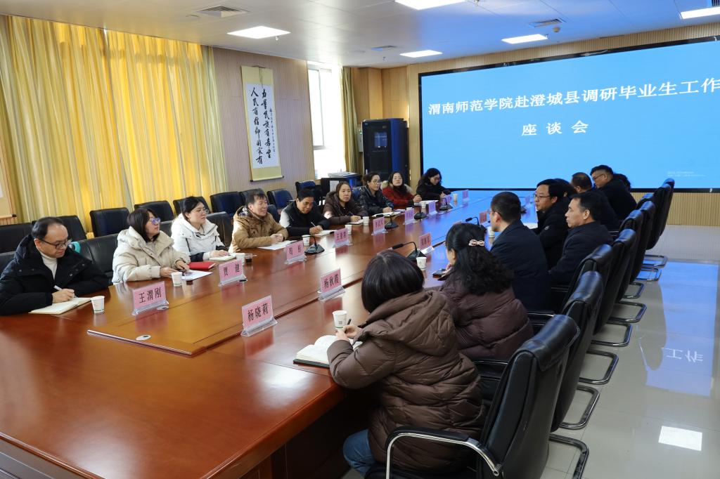 为精准把握基础教育师资需求动态,修订完善各专业人才培养方案,1月22日上午,9428cn太阳集团书记李武军,院长李西彩,王奎群,贾健,蒋彤,苟彤,聂娇等专业教师代表一行前往合阳县、澄城县教育相关部门开展调研活动,分别围绕相关专业教师需求数量、结构变化进行了座谈。