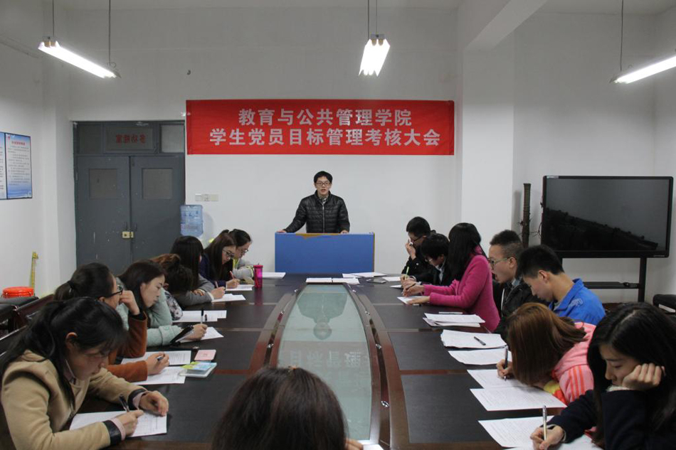 3月26日晚7:00,教育与公共管理学院在知新楼2218会议室举行了学生党员目标管理考核大会。这是学院自2013年10月实施学生党员目标管理制度以来的第二次考核大会,学院党总支副书记朱芳转、参与考核的学生党员和学生评委参加了考核会。