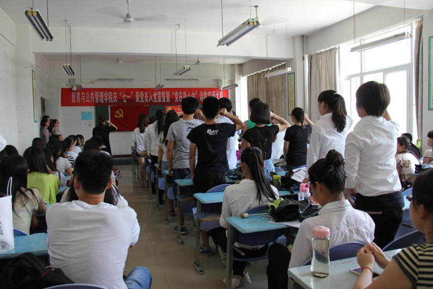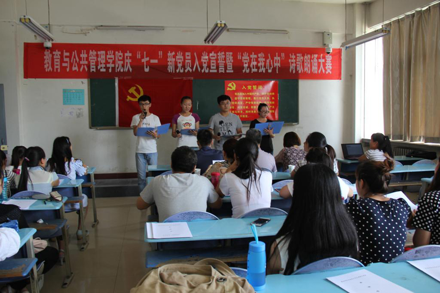 为了深入开展“三严三实”专题教育工作,加强对新党员的理想信念教育,增强新党员对党的事业的责任心和使命感,同时,积极庆祝党的94岁生日,7月1日下午2:00,教育与公共管理学院在知新楼2210教室举行了庆“七一”新党员入党宣誓暨“党在我心中”诗歌朗诵赛。党总支书记党旺旺、副书记朱芳转、学生党支部书记孙宁、总支秘书张馨艺及学院学生党员、“中国梦”理论学习研究会会员、入党积极分子约150余人参加了活动。活动由孙宁老师主持。渭南人民广播电台主持人张帆应邀担当了朗诵赛评委。