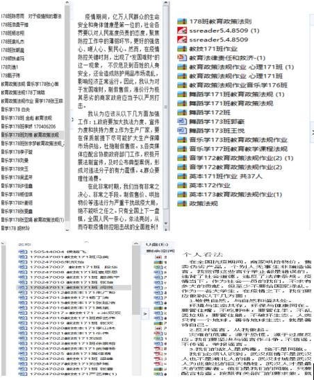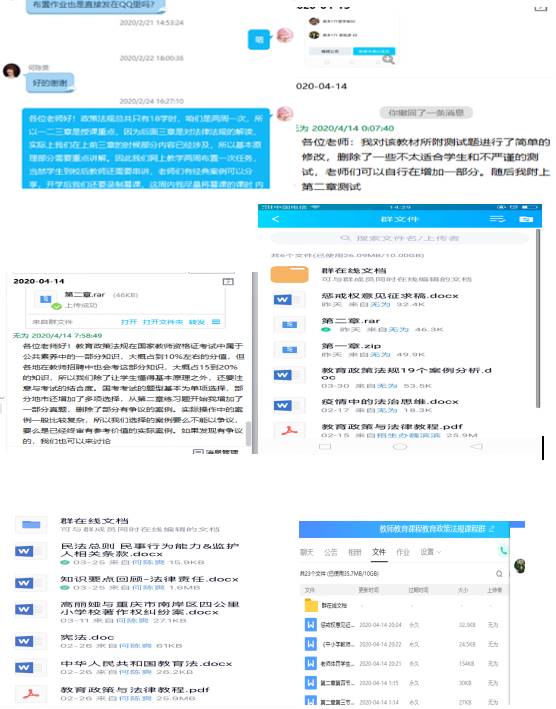 我院承担着学校8门教师教育类公共课,设计全校三个年级,上至学院领导,下至代课教师,大家都发挥自己的优势资源,提供在线教学的各种资源,同时成立的公共课主讲教师,每个教师负责每门课程的教授进度,资源共享,同时鼓励大家在集体布置任务的同时,开展网络在线自主学习加教师直播授课,利用各种软件与工具与学生建立沟通。及时与相关出版社联系将教材电子版发布给学生,同时利用超星网络资源,推荐有电子书目的辅助教材。公共课我承担着教育学基础4个班的教学,政策法规我承担着17班的教学任务,同时兼任两门专业课。我主讲教育政策法规课程,除了选择学堂在线同门课程让学生自学之外,我们还收集了相关案例,利用疫情期间出现的各种违法事件,引发学生反思讨论。同时针对教学实际和学科严谨性,对网络上的教学资源进行了筛选和修正。及时发布给任课教师。在开展直播以后,要求教师针对前面所学内容专门进行一次串讲,以达到知识的巩固性。做到前后有衔接。。