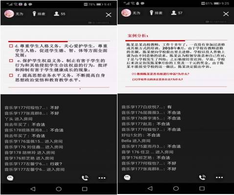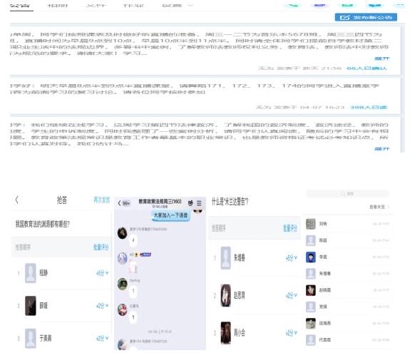 为了做好线上学习指导和督导,我们公共课设计每章单元导学,制定每节课学习任务,课前通过平台发布章节导学单和课堂学习任务,并附上相应的练习题,课后教师网上互动解答。引导学生养成课前预习、直播讨论,随堂测验、课后复习、及时完成作业和课后反思的习惯,使学生有章可循完成学习任务。针对疫情中的学习进行了调研,了解学生学习动态,从发布任务,互动聊天,到开始直播,教师和学生相互在学习的探索中掌握了教学资源的获取和学习方法。我的专业课教育管理学在学习通开设,除了要求学习交电子版的作业,还通过通知跟帖方式达到和学生的互动。其他课程在QQ群进行不限定时间与主题讨论,从家居生活能力到疫情中出现的违法事件,失德现象、英雄事迹进行讨论。80%学生都反映这种教学方式让他们都学到了很多,而且都希望开学以后能实现线上线下全方位教学,说明我们的学生在学习方面的主动性较强。30%的同学反映长期看电子产品眼睛不舒服,希望尽早开学。有些老师在互动的时候还采取了多种趣味方式引发学生的学习兴趣。比如说何陈爽老师将线上教学资源与直播方式相结合,让学生参与到课堂中来,营造轻松氛围,通过抢答环节巩固知识,通过不断地琢磨讨论,一起寻求“答案”。