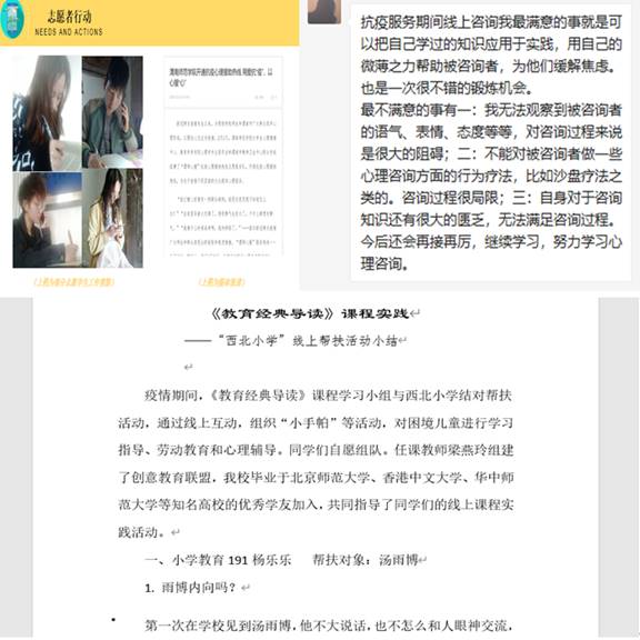 一、在线服务学习激发的愤悱困顿状态。疫情一开始,我们就确定了本次线上教学主题:“学爱的智慧,做人类一新分子”。启发大家在新生活来临时做好充分准备。同时,课程在线学习启动前,就发动入党积极分子心理学171班长孙雨欣组织同学开展“心援热线”的专业实践活动,我们的骨干教师、实践基地专家都参与了进来。线上学习开始的时候,其他专业3名同学也主动加入学习群。学习讨论期间,还特别邀请在新疆从教的14级汪瑜同学,疫情期间志愿服务受到群众表扬的教育技术学14级郝永强同学等和大家一起分享讨论。课程学习小组19级小学教育专业同学继续开展西北小学困境儿童线上帮扶。同情、共情、同理心究竟表达了人类情感的什么规律?自私与自爱究竟如何区分?如何观察儿童的行为?如何才能避免个人偏见对判断的影响?……大家带着困惑问题,阅读分享,不仅课堂学习参与度一直较高,讨论交流时有碰撞,你追我赶的学习氛围浓郁起来了。
