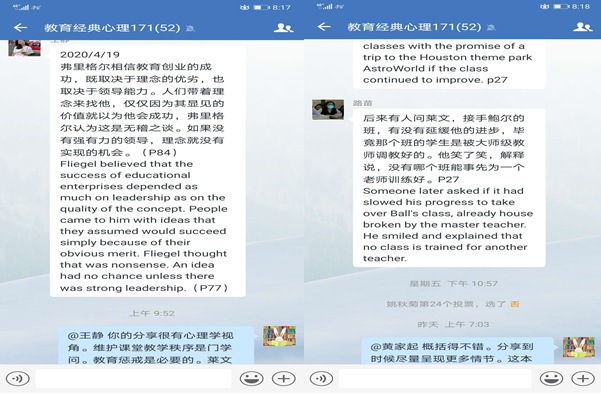 三、在线“每日功课”天天做。前三周,作业每周一次,要求综述分析阅读的材料。经过调查和作业效率观察,普遍反映难度大。调整为每日功课。同学们每日读书,每日分享,中英文对照。大家相互浏览积累阅读积分。每周整理汇总,课堂分享交流。课程学习开始前的调查发现,全班46人均有考研意向。但教学中发现,至少十余人不坚定。从教准备一般:5人通过教资考试。学生骨干带头作用好:积极分子12人,考察对象5人,预备党员1人。学习成绩均在班级中上水平。有两名藏族同学。英语四级过线12人,分数均不高。为了让同学们在居家生活中学会与家长尊重共处,坚定专业志向,通过讨论决定,教学就从给未来自己的一封信开始。跟上作者对经典心理学研究信守拈来、仔细缜密的分析推理,挑战了学术能力。通过这⼀活动发现,⼤家的学习收获很大:用同学们的自己话说就是:提高了自己逻辑思维能力,开拓了学术视野,学会分析判断,学术表达。